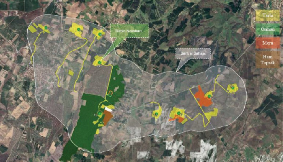 Trakya Alt Bölgesi Ergene Havzası 1/100.000 ölçekli Çevre Düzeni Planı’nda proje sahası; orman, tarım alanı ve kırsal yerleşim bölgeleri içinde yer alıyor. ÇED dosyasında yer alan bilgilere göre, T2-T7 numaralı türbinler tarım arazisi üzerinde, T8 numaralı türbin ise mera alanında bulunuyor. Şalt merkezi ile enerji depolama tesisinin orman vasıflı arazide yer aldığı belirtildi. T1 türbinine ilişkin ise herhangi bir parsel kaydına ulaşılamadığı aktarıldı.