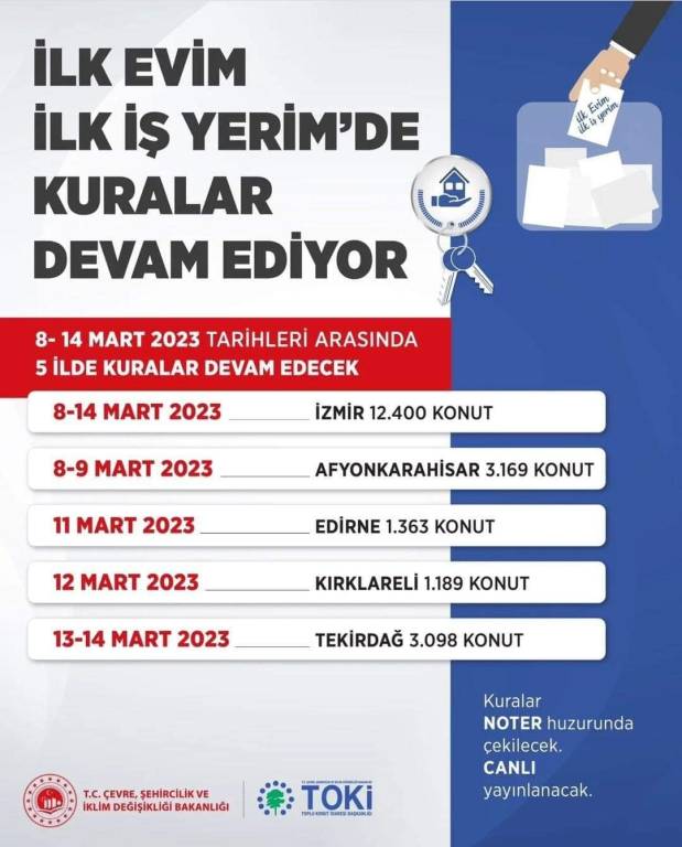 Çevre, Şehircilik ve İklim Değişikliği Bakanlığı ve Toplu Konut İdaresi Başkanlığı (TOKİ) tarafından, depremler nedeniyle ara verilen “İlk Evim, İlk İş Yerim” ve “İlk Evim Arsa” projelerinin kura çekimlerinin yeniden başladığı bildirildi.