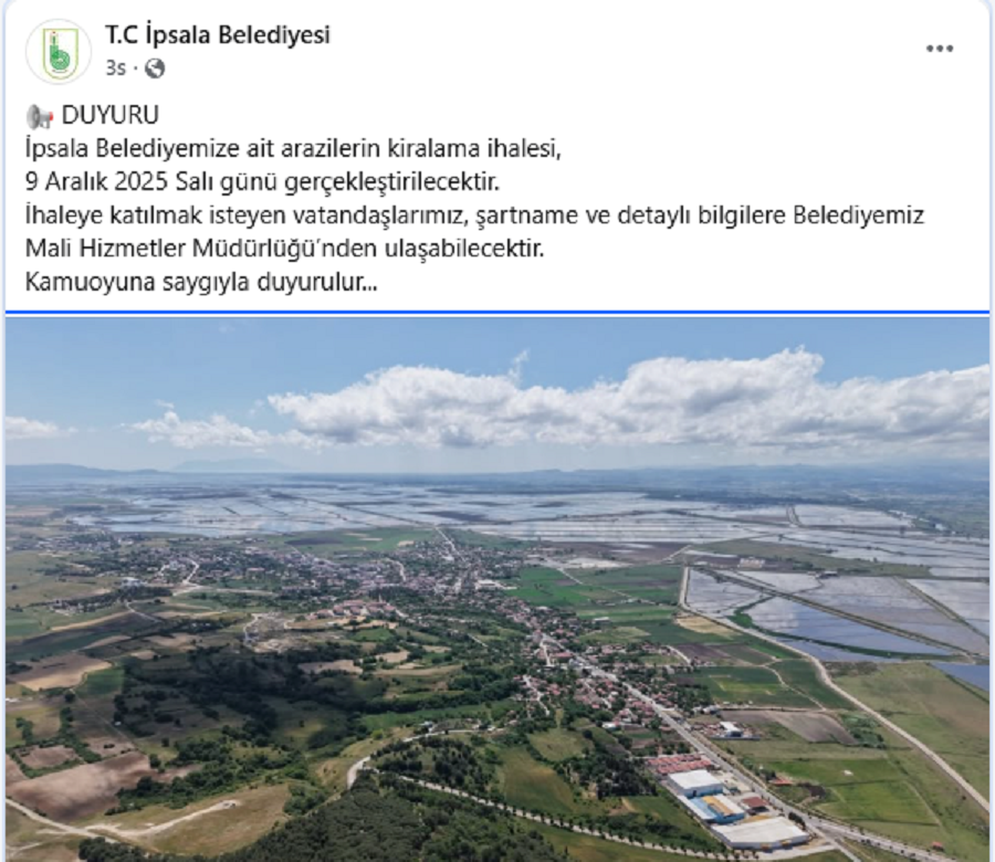 İpsala Belediyesi, mülkiyetinde bulunan arazilerin kiralama ihalesinin 9 Aralık 2025 Salı günü gerçekleştirileceğini açıkladı.