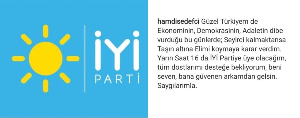 Sedefçi, paylaşımında; “Güzel Türkiye’mde ekonominin, demokrasinin, adaletin, dibe vurduğu bu günlerde, seyirci kalmaktansa taşın altına elimi koymaya karar verdim. Saat 16.00’da İYİ Parti’ye üye olacağım. Tüm dostların desteğini bekliyorum. Beni seven, bana güvenen arkamdan gelsin. Saygılarımla…” ifadelerine yer verdi.