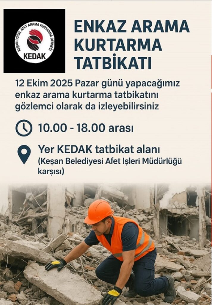 “Tatbikatlarda neler yapıldığını ve KEDAK ekibinin nasıl hazırlandığını görmek isteyen tüm vatandaşlarımızı bekliyoruz. Keşan’da bir arama kurtarma derneği var; bu ekip neler yapıyor diye merak eden herkes gelip gözlemleyebilir.”
