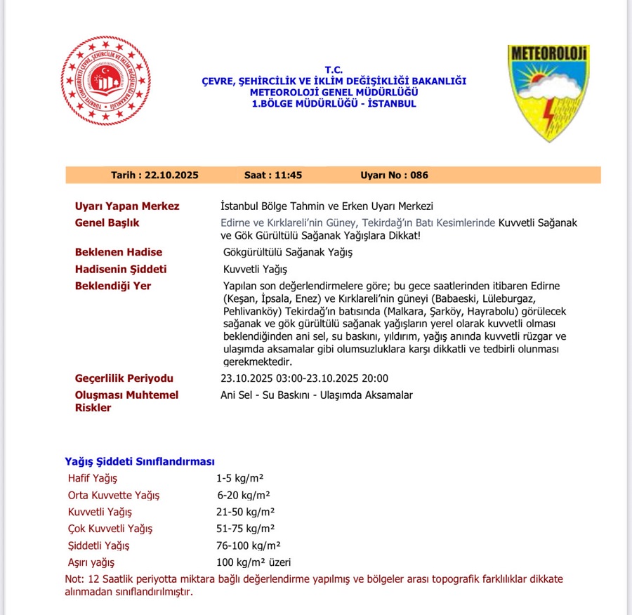 Meteoroloji Genel Müdürlüğü (MGM) İstanbul Tahmin ve Erken Uyarı Merkezi, Trakya bölgesi için kuvvetli yağış uyarısında bulundu.