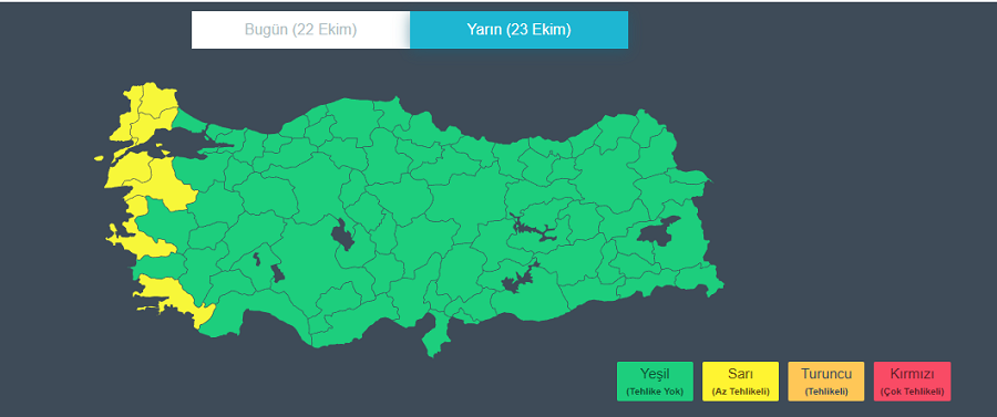 Yağışların 23 Ekim Perşembe günü saat 03.00 ile 20.00 arasında etkili olacağı bildirildi.