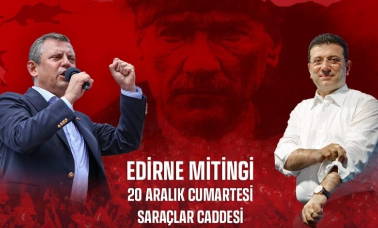 Cumhuriyet Halk Partisi (CHP) Genel Başkanı Özgür Özel, “Millet İradesi’ne Sahip Çıkıyor” sloganıyla düzenlenecek miting kapsamında 20 Aralık Cumartesi günü saat 13.30’da Edirne Saraçlar Caddesi’nde halka seslenecek.